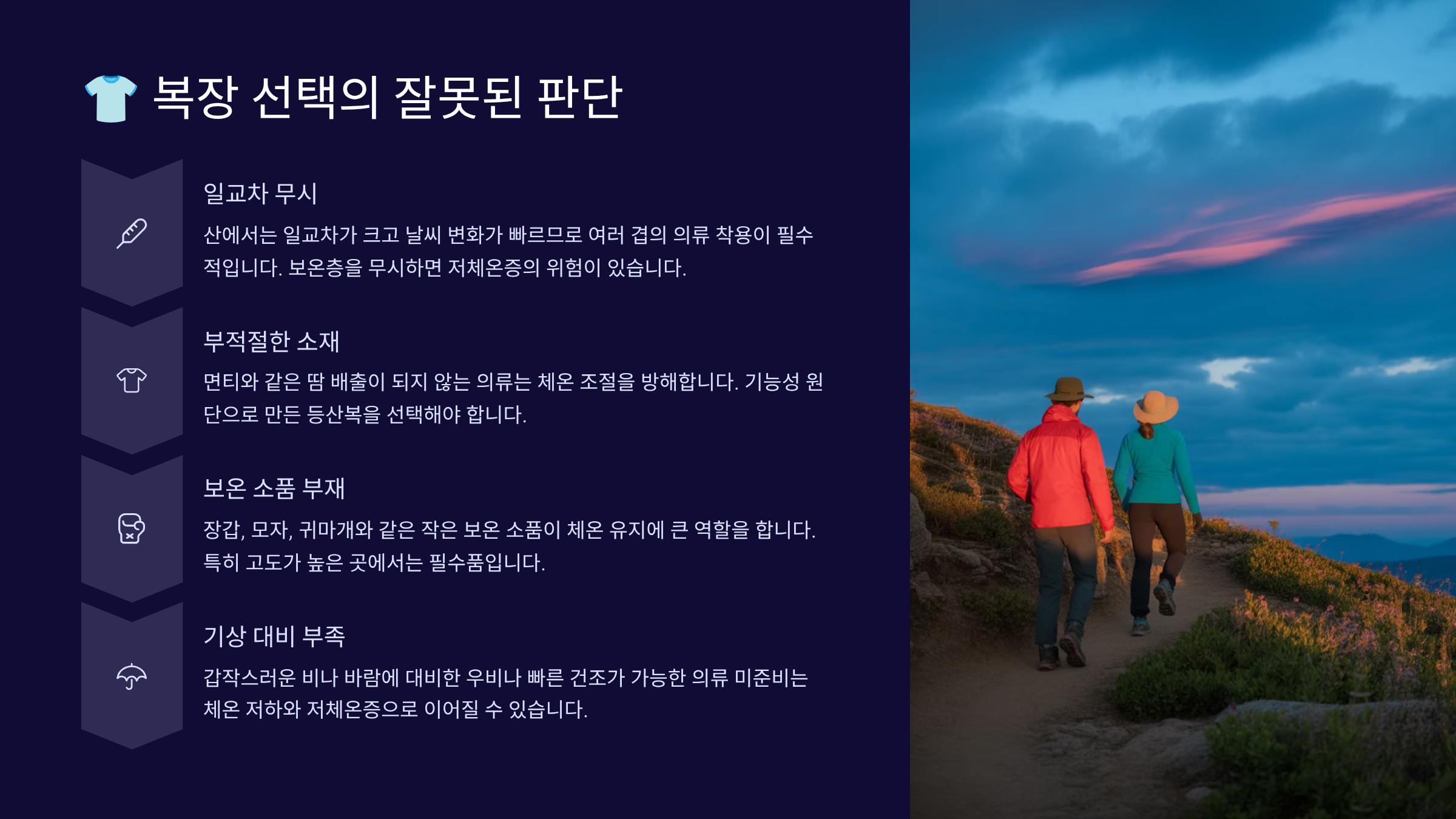 체온 관리를 소홀히 하는 것도 위험해요. 저체온증은 여름에도 발생할 수 있어요. 비에 젖거나 땀이 식으면서 체온이 급격히 떨어질 수 있거든요. 몸이 떨리고 말이 어눌해지면 즉시 따뜻한 옷을 입고 따뜻한 음료를 마셔야 해요. 체온 유지는 생존과 직결된다는 걸 명심하세요.