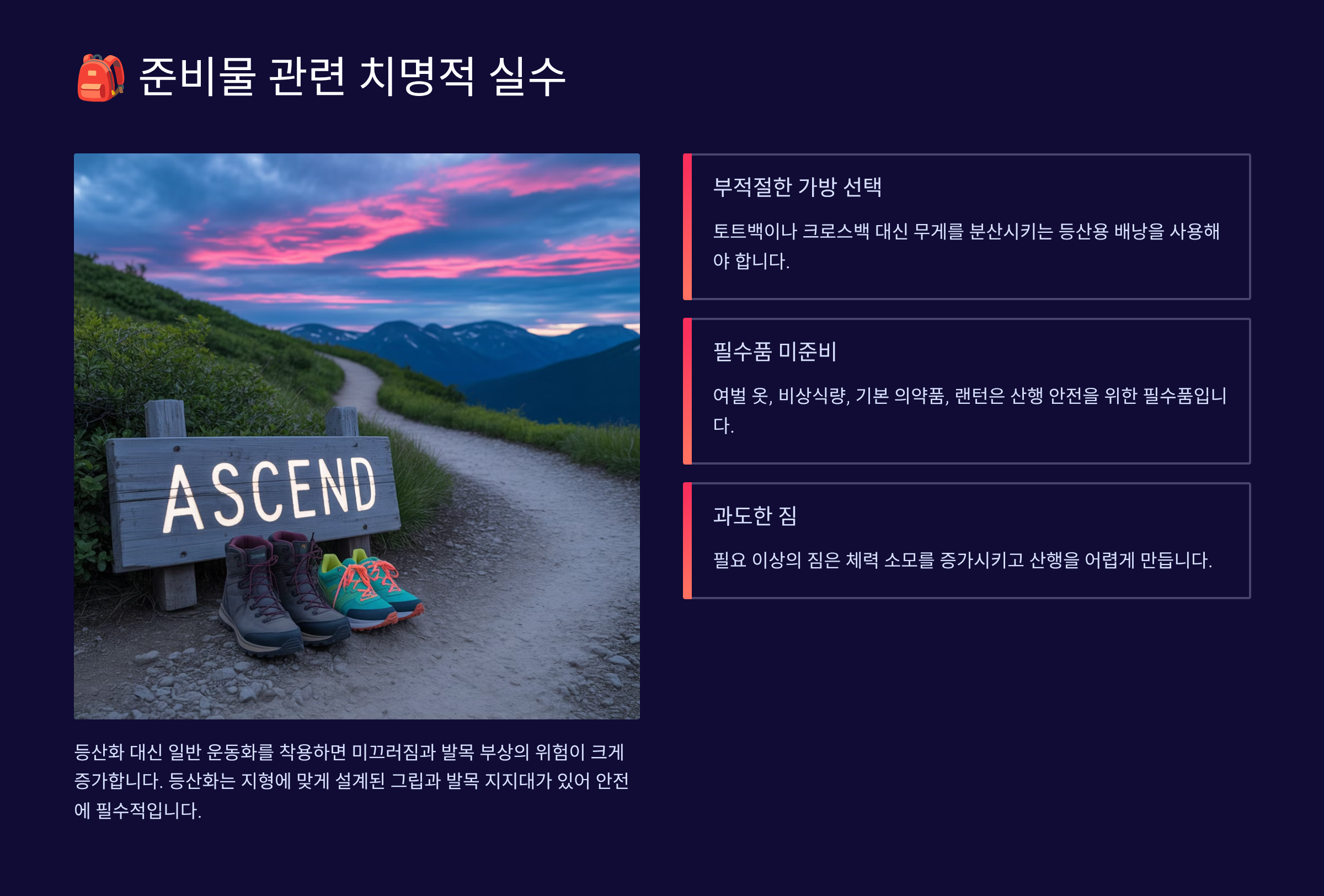 등산 준비물을 제대로 챙기지 않는 것은 초보자들이 가장 많이 저지르는 실수예요. '동네 뒷산인데 뭘 그렇게 많이 챙겨?'라는 안일한 생각이 큰 화를 부를 수 있답니다. 실제로 낮은 산에서도 조난 사고가 빈번하게 발생하고 있어요. 준비물은 단순히 편의를 위한 것이 아니라 생명과 직결된 필수품이라는 인식을 가져야 해요.