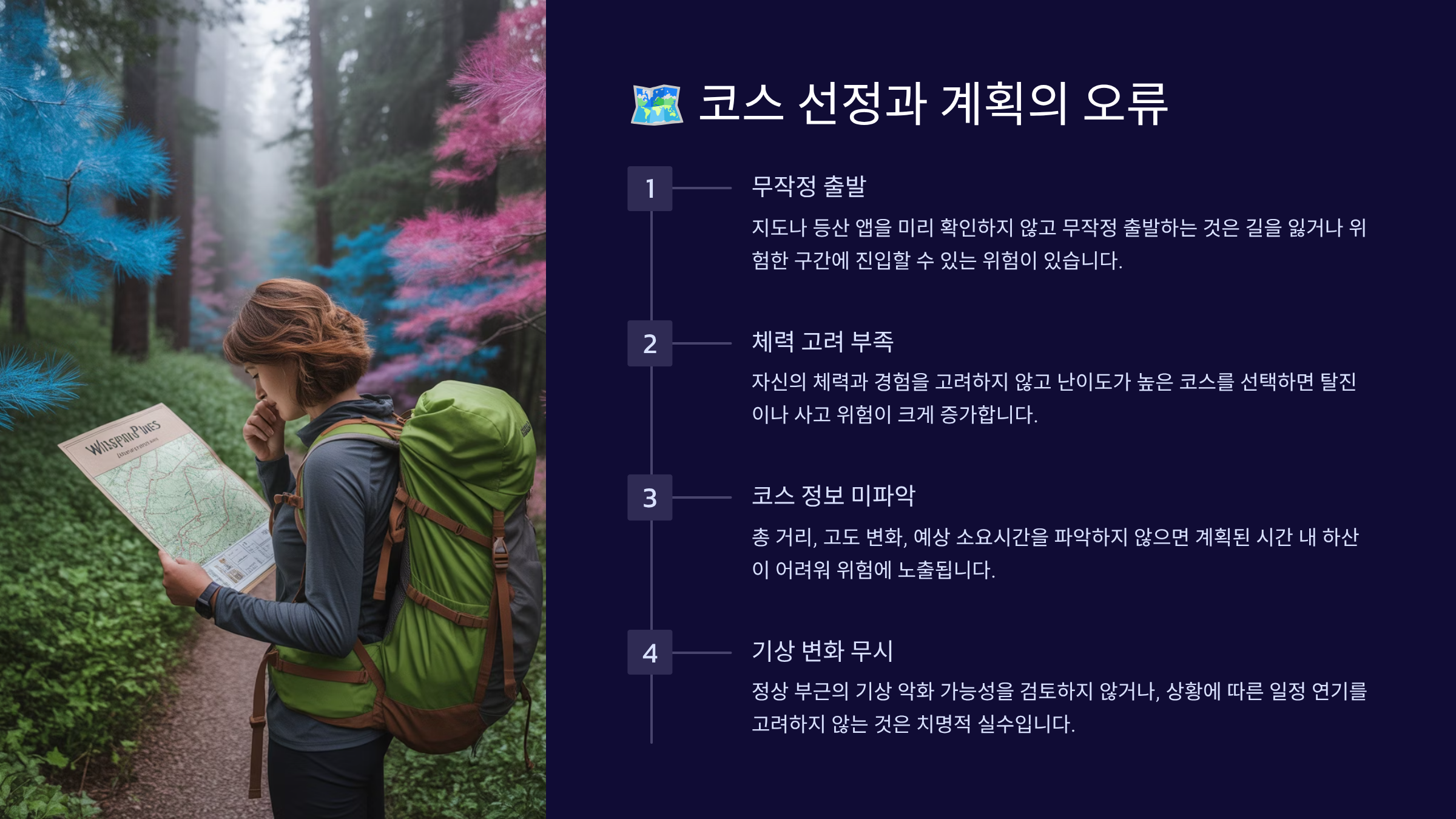 일출이나 일몰을 보겠다고 무리한 계획을 세우는 것도 위험해요. 새벽 산행은 시야 확보가 어렵고 기온이 낮아서 위험하고, 일몰 산행은 하산 시 어두워져서 조난 위험이 커요. 초보자라면 오전 9시쯤 출발해서 오후 3-4시에는 하산을 완료하는 게 가장 안전해요.