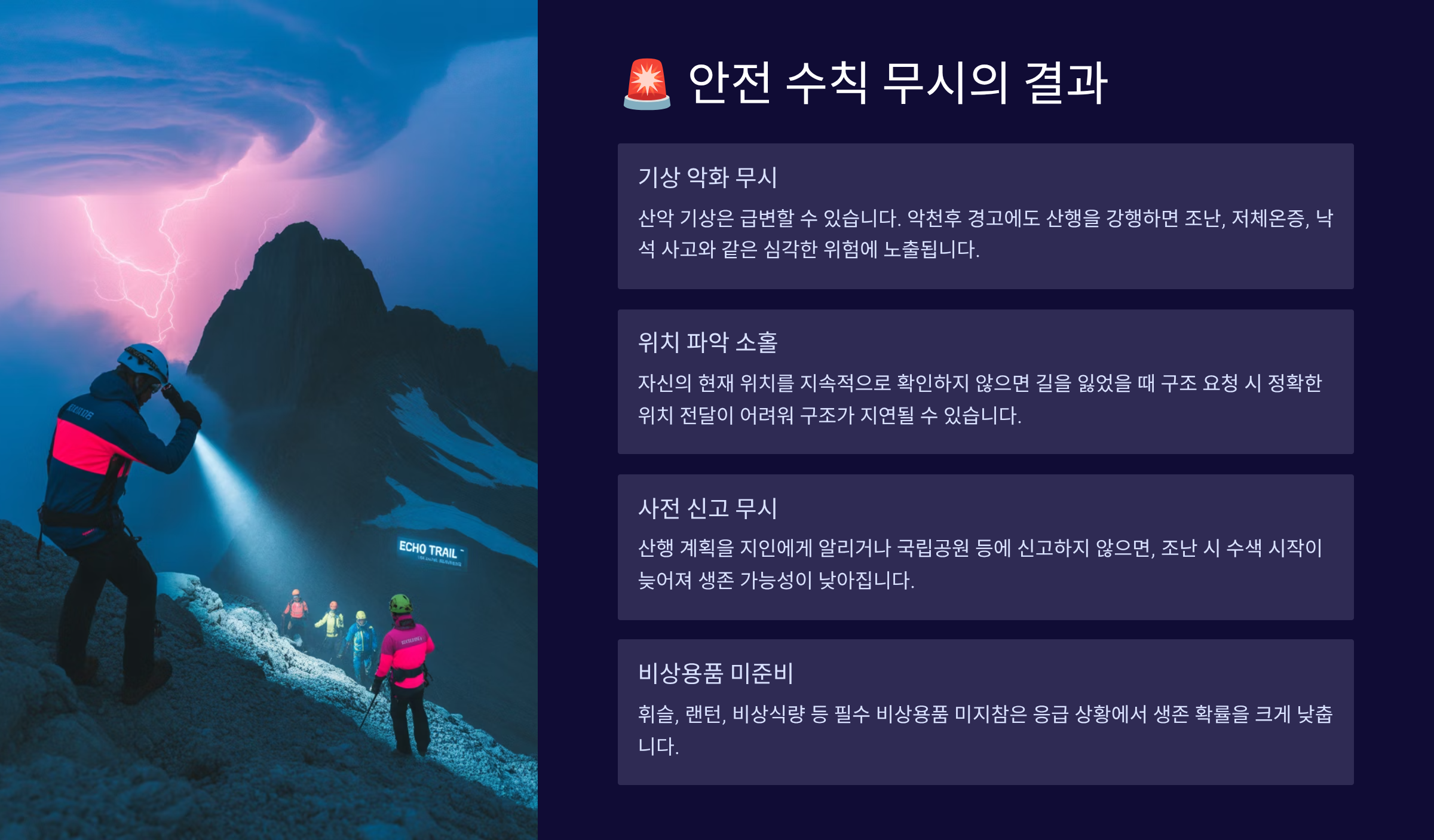 가장 기본적인 실수는 등산 신고를 하지 않는 거예요. 국립공원이나 도립공원에는 입산 신고함이 있는데, 귀찮다고 그냥 지나치는 경우가 많아요. 하지만 조난 시 구조대가 수색 범위를 좁히는 데 큰 도움이 되고, 하산 확인이 안 되면 수색에 나서게 돼요. 온라인으로도 간단히 신고할 수 있으니 꼭 하세요!