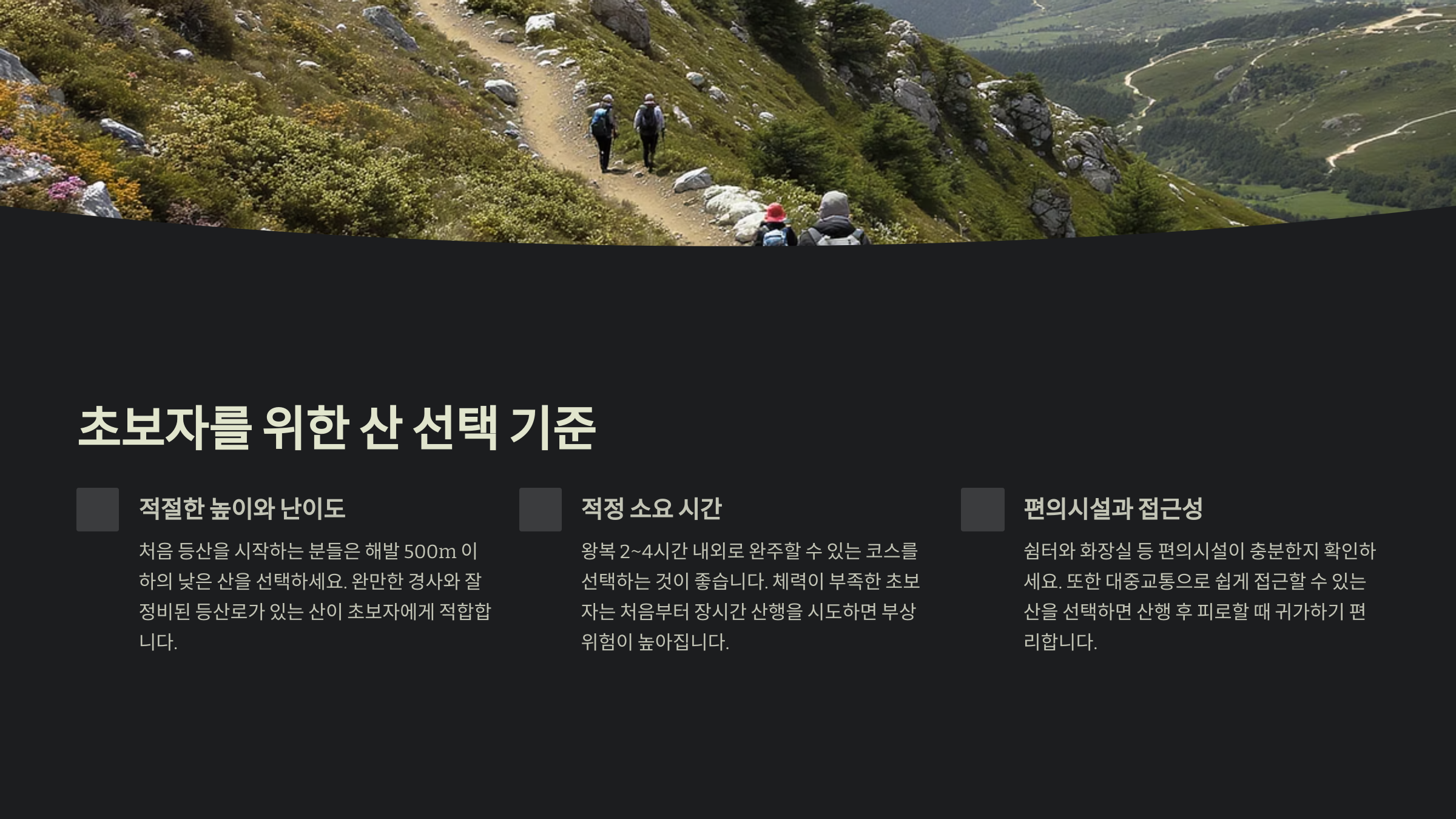 초보자 명산 등반 가이드📋 목차🎒 초보자 등산 준비사항⛰️ 전국 명산 선택 기준🏔️ TOP5 명산 상세 가이드⚠️ 등산 안전 수칙🌸 계절별 등산 팁🧗 등산 장비 추천💪 등산 후 관리법❓ FA