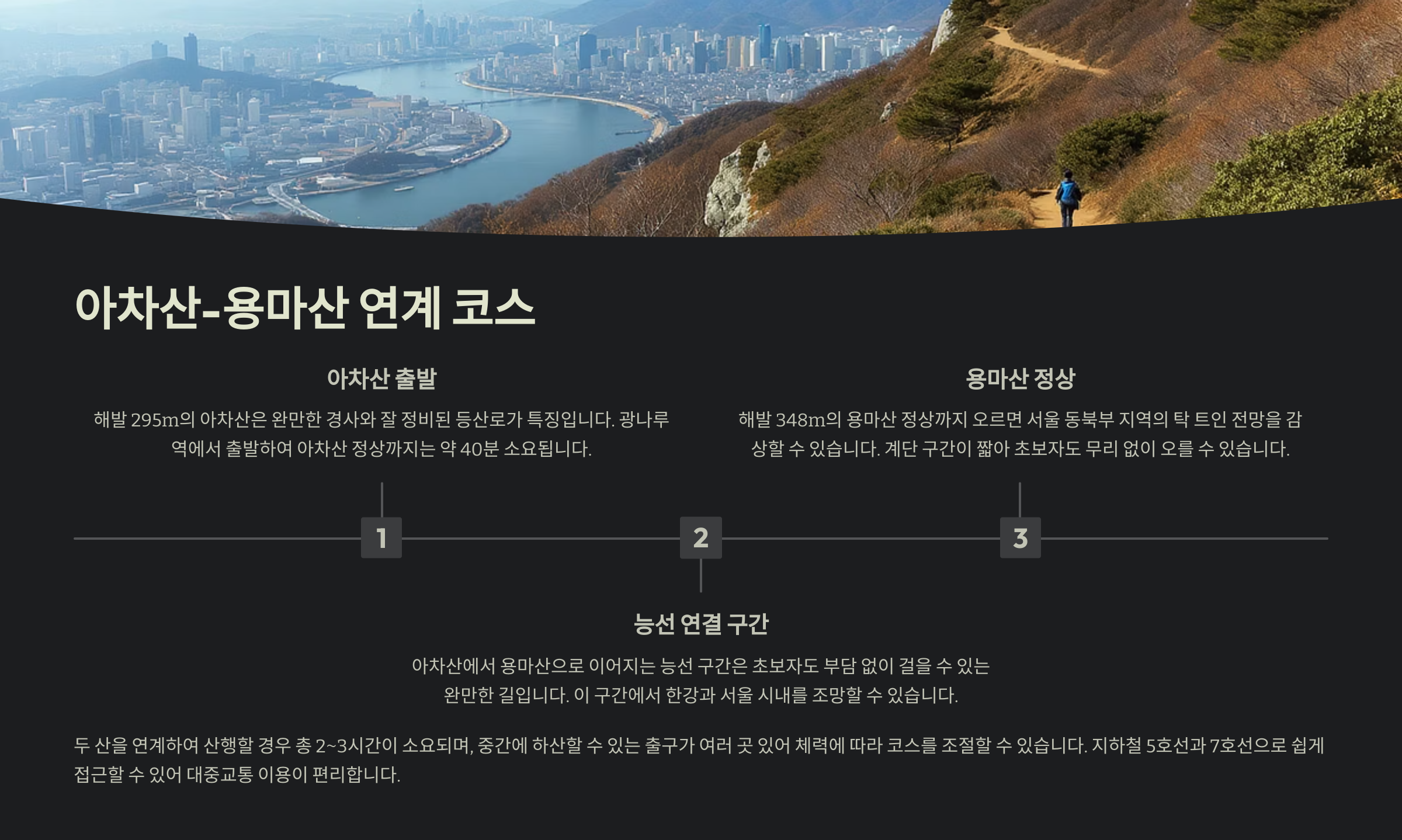 체력이 괜찮다면 아차산에서 용마산까지 연계해서 등산하는 것도 추천해요. 아차산 정상에서 용마산까지는 능선을 따라 약 1.5km 거리예요. 오르막과 내리막이 반복되지만 경사가 완만해서 초보자도 충분히 도전할 만해요. 용마산 정상(해발 348m)에서는 더 넓은 전망을 볼 수 있고, 특히 북한산과 도봉산이 한눈에 들어와요.