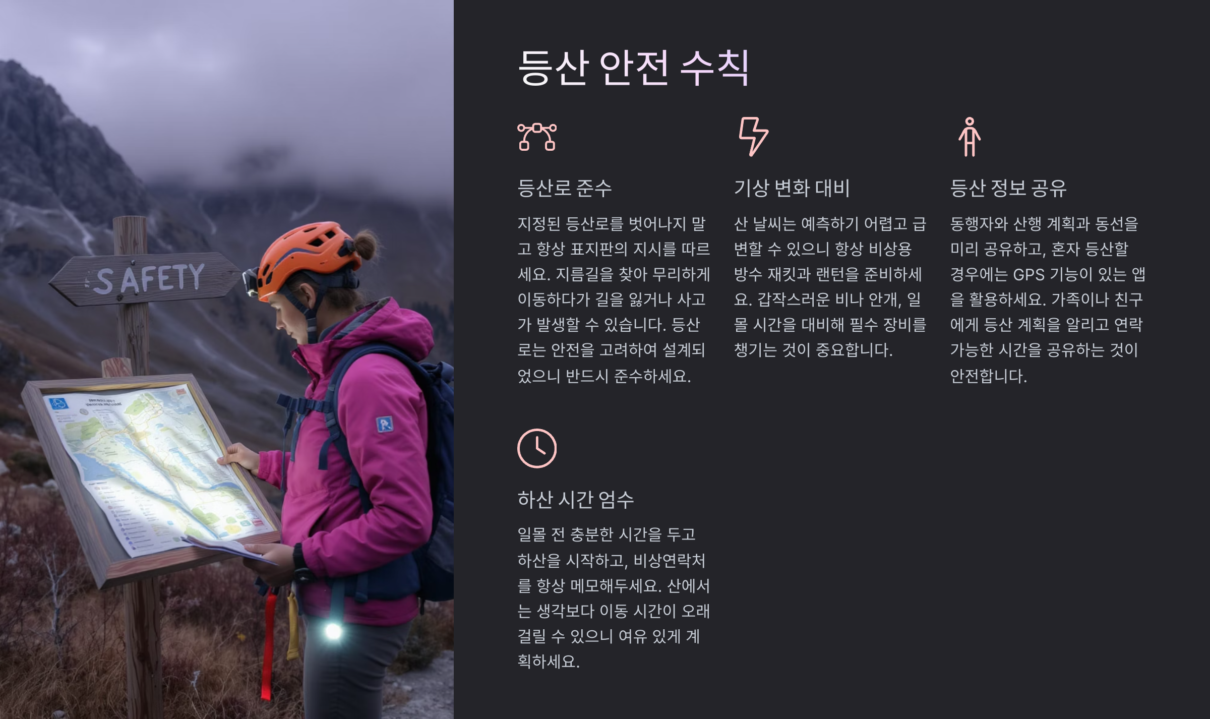 등산로 준수 | ⭐⭐⭐⭐⭐ | 표지판 확인 | GPS 앱 사용 |