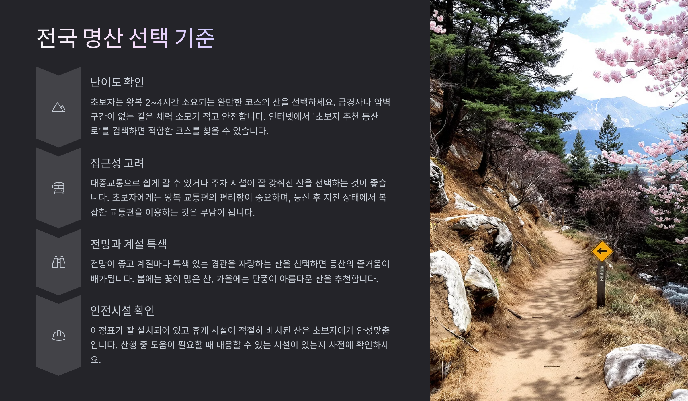 등산로의 난이도도 중요한 선택 기준이에요. 대부분의 산에는 여러 개의 등산로가 있는데, 초보자용, 중급자용, 상급자용으로 나뉘어져 있어요. 초보자는 반드시 초보자용 코스를 선택해야 해요. 이런 코스는 보통 능선길이 많고 급경사 구간이 적어서 무리 없이 오를 수 있어요. 또한 중간중간 쉼터나 전망대가 있어서 휴식도 취하고 경치도 감상할 수 있답니다.