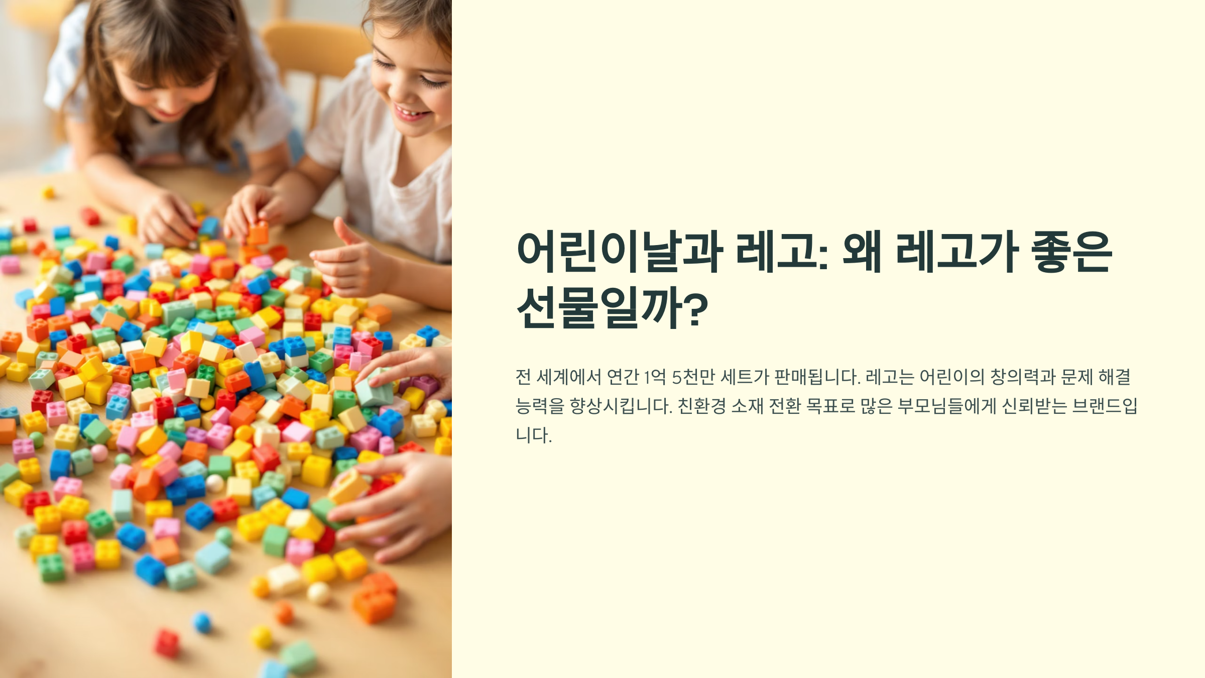그 가운데에서 레고는 오랜 시간 동안 꾸준히 사랑받는 대표적인 어린이날 선물 중 하나로 자리잡았어요. 단순히 조립하는 장난감이라는 이미지에 그치지 않고, 아이들의 창의성과 공간 인식 능력을 자연스럽게 키워주는 교육적 도구로 인식되고 있어요. 수백 개의 작은 블록을 하나하나 조합하며 만들어가는 과정은 단순히 손놀림을 유도하는 것이 아니라, 아이의 논리적 사고와 문제 해결 능력을 함께 발전시켜주죠.