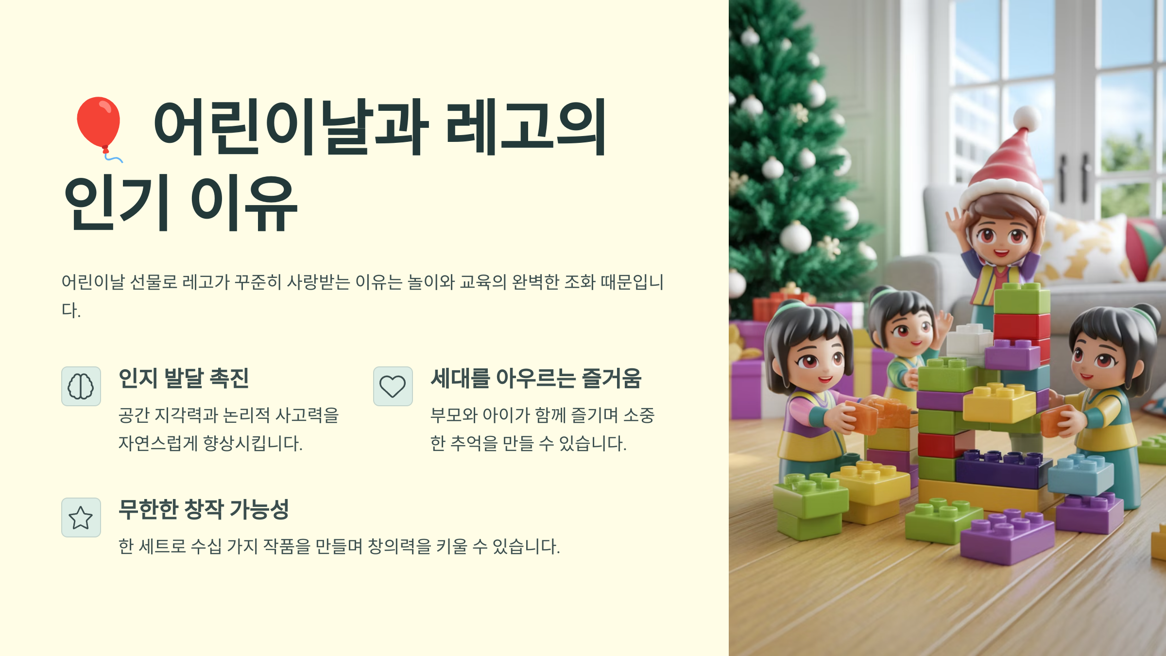 레고의 인기는 단지 유행을 따르기 때문이 아니에요. 아이가 스스로 조립한 결과물을 보며 느끼는 성취감, 부모와 함께한 시간에서 비롯되는 애착, 그리고 오랜 시간 즐길 수 있는 콘텐츠의 확장성이 모두 복합적으로 작용한 결과예요. 그렇기에 레고는 단순한 선물 이상의 의미를 가지는, 아이 인생에서 잊지 못할 추억이 되기도 해요. 🎉