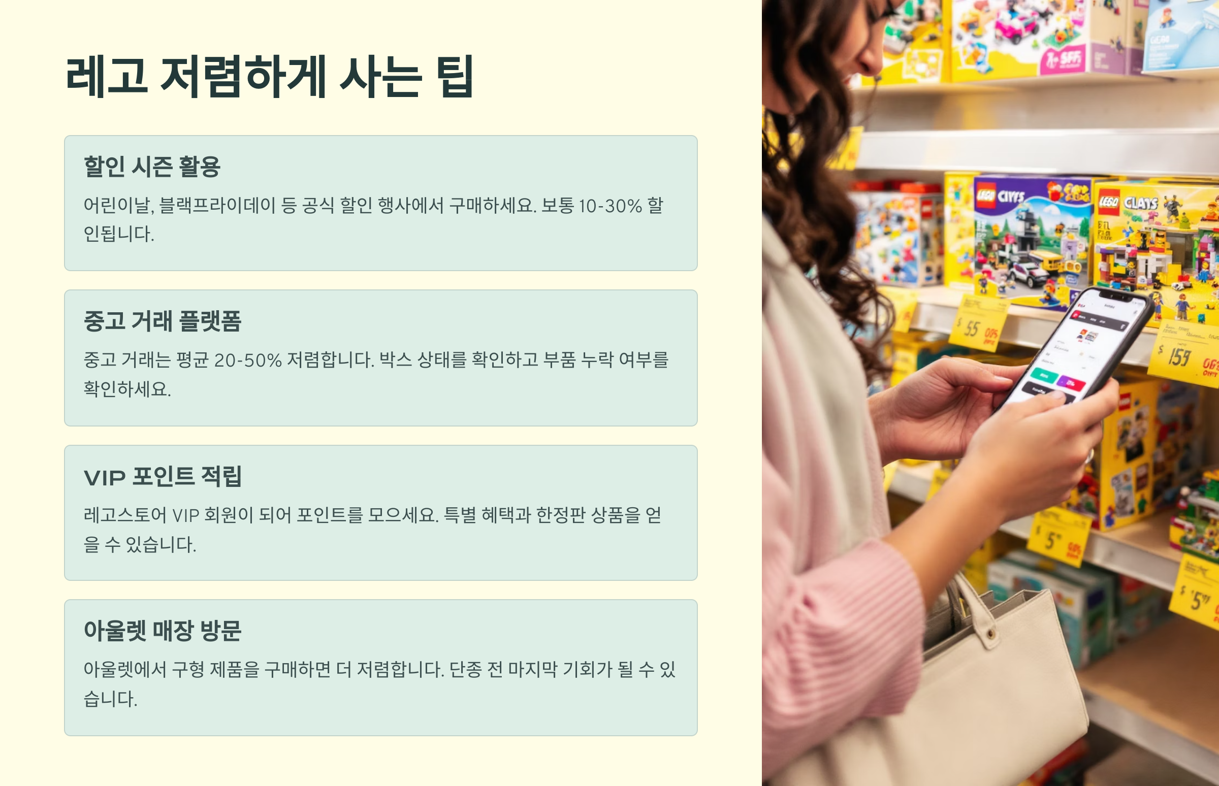 레고는 브랜드 특성상 정가가 높게 형성되어 있는 경우가 많지만, 다양한 루트를 활용하면 보다 합리적인 가격에 구매할 수 있어요. 특히 어린이날, 크리스마스 시즌처럼 수요가 몰리는 시기에는 조금만 빠르게 움직여도 품절 전 좋은 가격에 구매할 수 있는 기회를 잡을 수 있어요. 아래는 실속형 쇼핑을 위한 필수 꿀팁이에요!