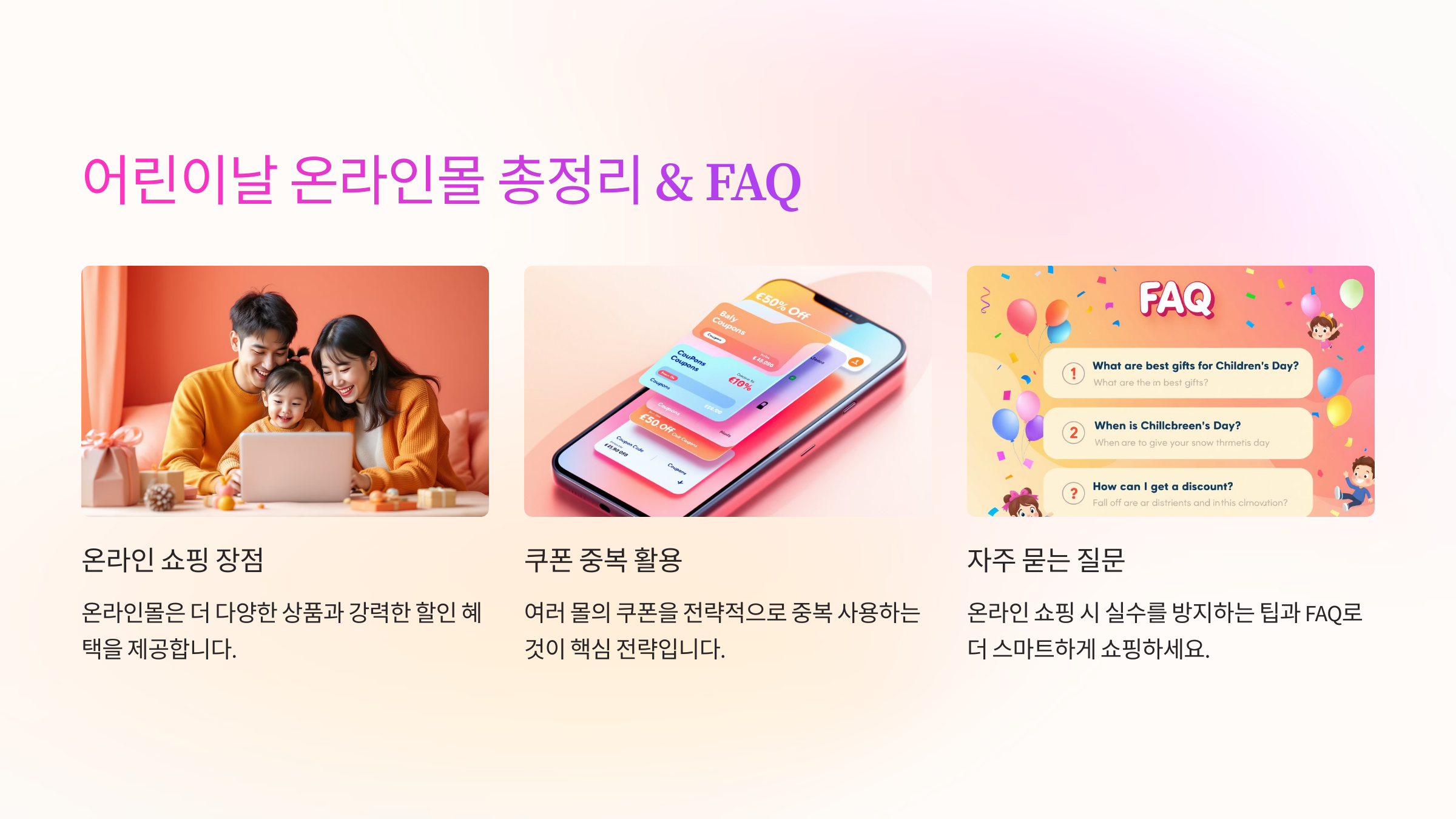 마지막으로, 모바일 간편결제, 적립금, 포인트 사용 등 추가적인 혜택이 온라인에서만 가능한 경우도 많습니다. 이러한 요소들을 종합해 볼 때, 2025년 어린이날 선물은 오프라인보다 온라인몰에서 구매하는 것이 훨씬 유리하다는 결론에 도달하게 됩니다. 😎