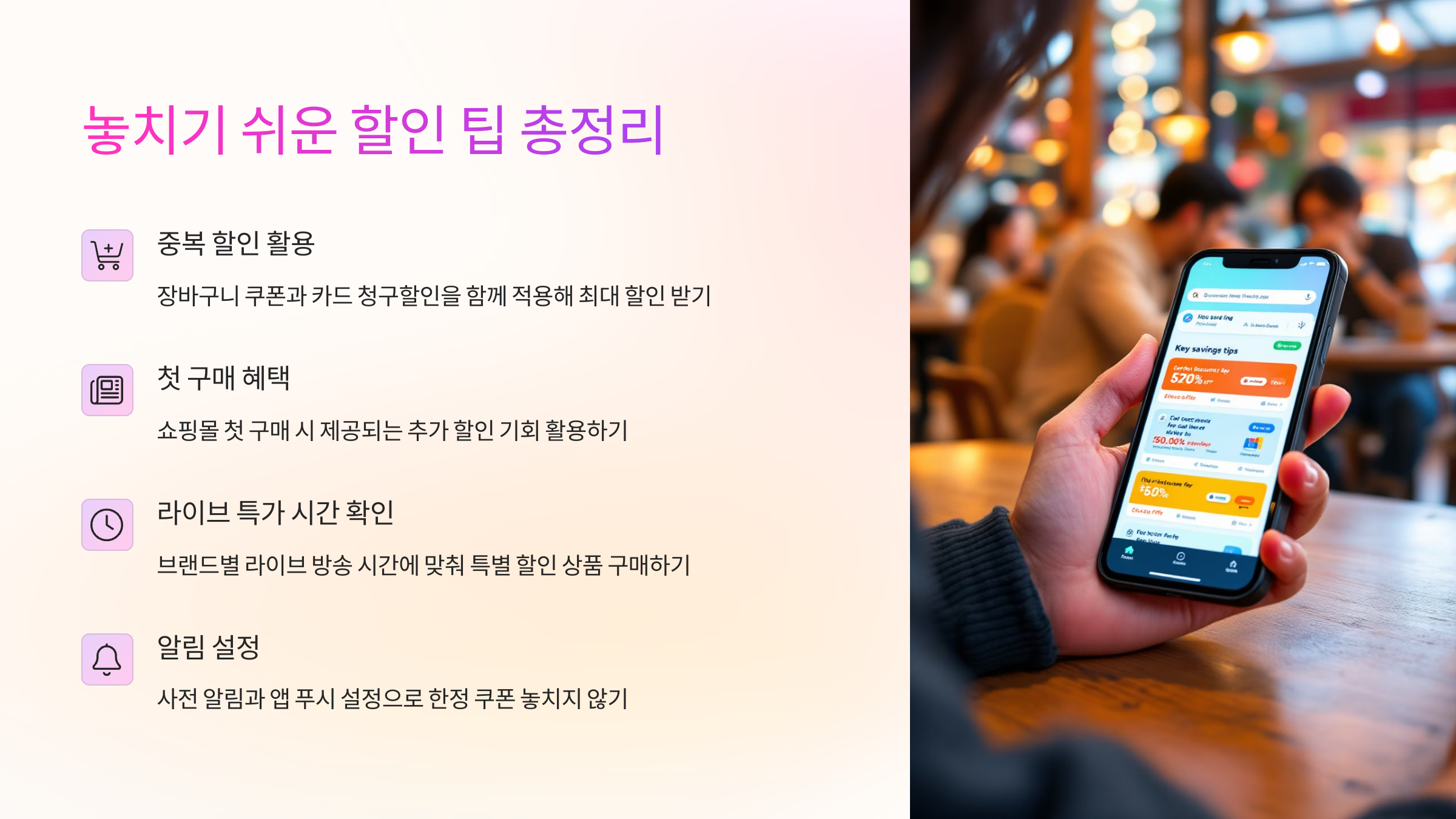 온라인몰의 할인 혜택은 복잡하게 보이지만, 몇 가지 기본 규칙만 알면 매우 쉽게 활용할 수 있습니다. 특히 아래 사항들을 숙지해두면 같은 제품도 훨씬 저렴하게 구매할 수 있어요!