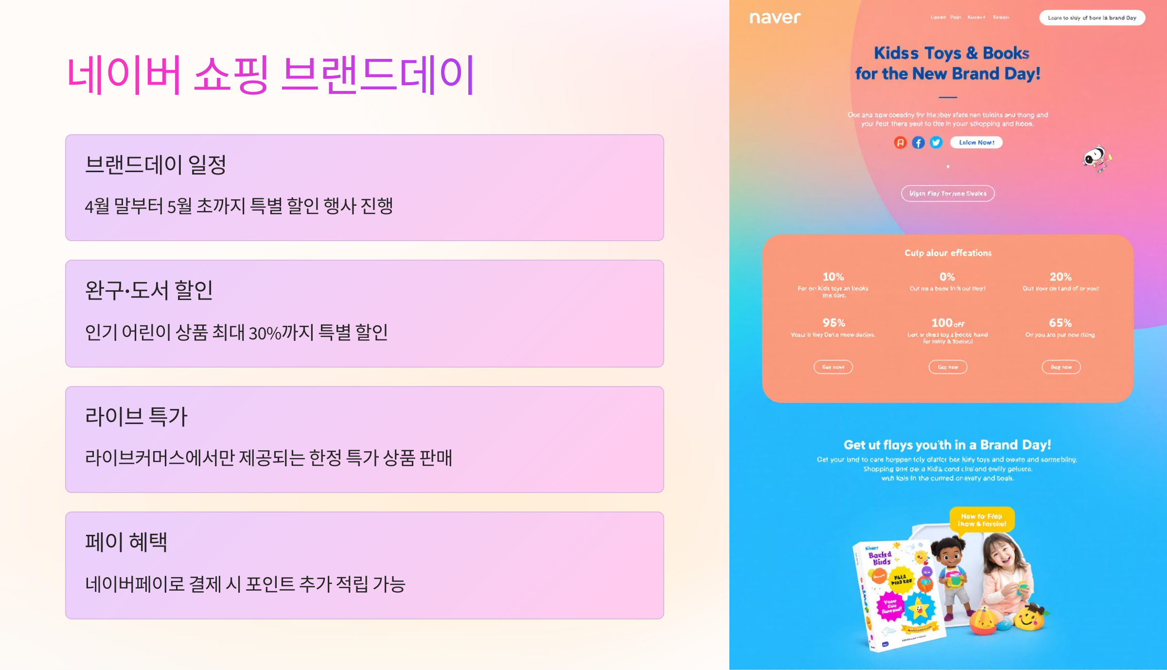 네이버 쇼핑은 2025년 어린이날을 맞아 ‘브랜드데이’를 중심으로 다양한 할인 이벤트를 전개하고 있습니다. 이 브랜드데이는 4월 하순부터 어린이날 직전까지 이어지며, 매일 다른 브랜드가 중심이 되어 특가 혜택을 제공합니다. 단순한 상품 할인뿐 아니라 쿠폰, 카드사 제휴 할인, 포인트 적립 등 종합적인 혜택 구조로 소비자들의 만족도를 높이고 있습니다.