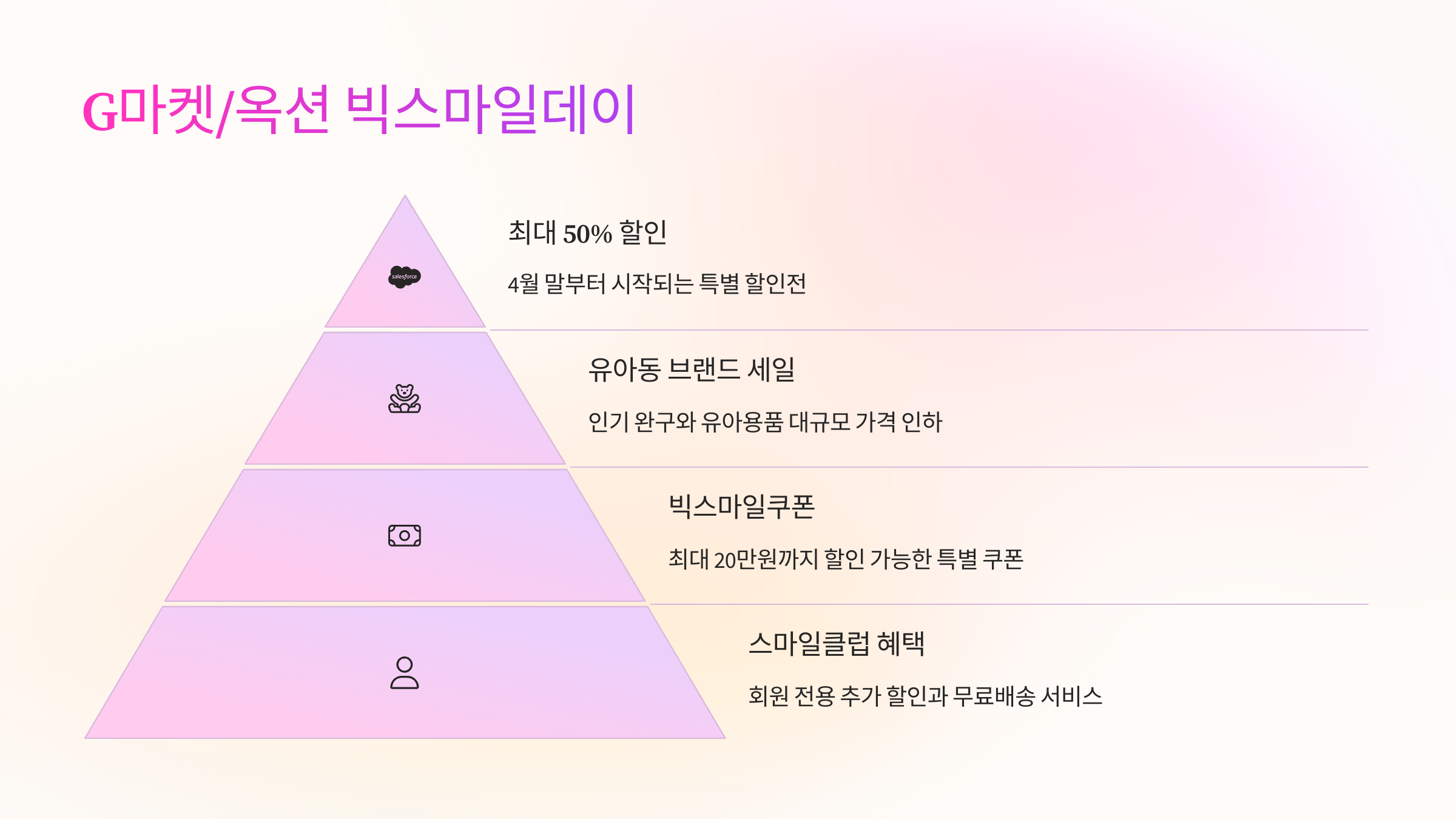 G마켓과 옥션은 매년 상반기와 하반기 두 차례 ‘빅스마일데이’라는 대형 세일 이벤트를 진행합니다. 특히 상반기 이벤트는 어린이날과 일정이 맞물려 있어, 키즈 카테고리 중심의 상품군이 집중 할인되는 기간으로 알려져 있습니다. 2025년에는 4월 27일부터 빅스마일데이가 시작되며, 약 2주간 이어질 예정입니다.