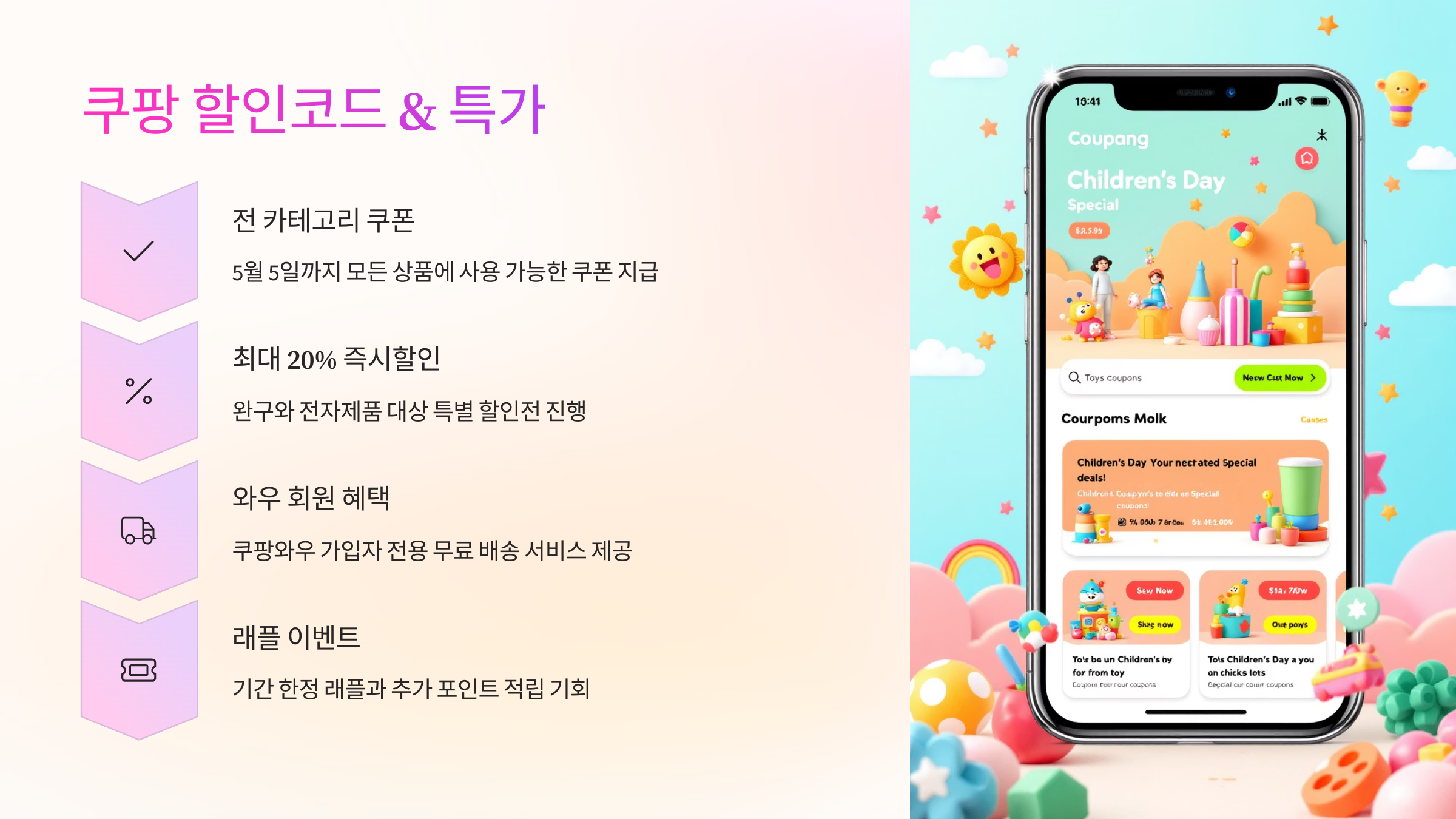 쿠팡은 대표적인 빠른 배송 시스템과 다양한 쿠폰 이벤트로 유명합니다. 어린이날에는 '어린이날 기획전'을 따로 운영하며, 특정 인기 완구 브랜드나 키즈용품을 중심으로 25%까지 할인 혜택을 제공합니다. 특히 로켓배송 상품을 중심으로 구성되어 있어, 어린이날 당일에 맞춰 급하게 선물을 준비해야 하는 상황에서도 매우 유용합니다.