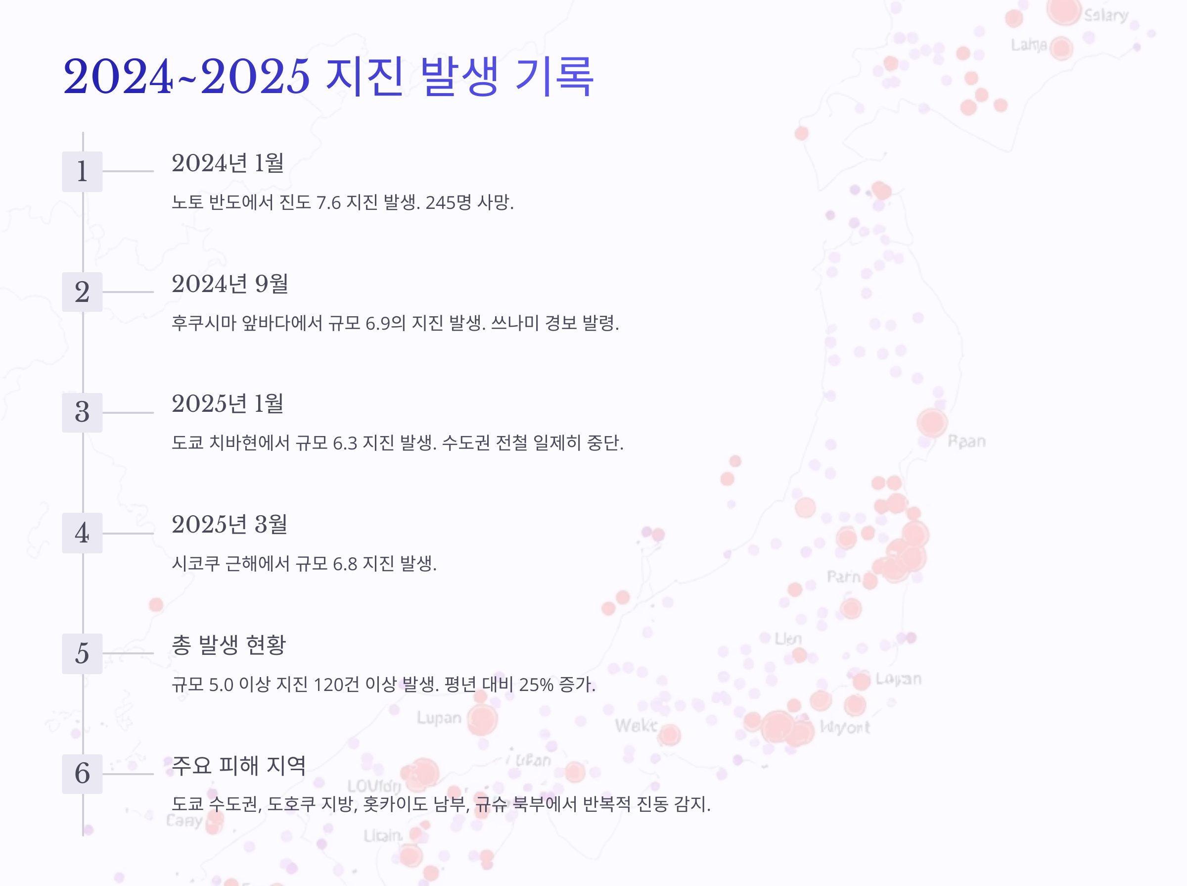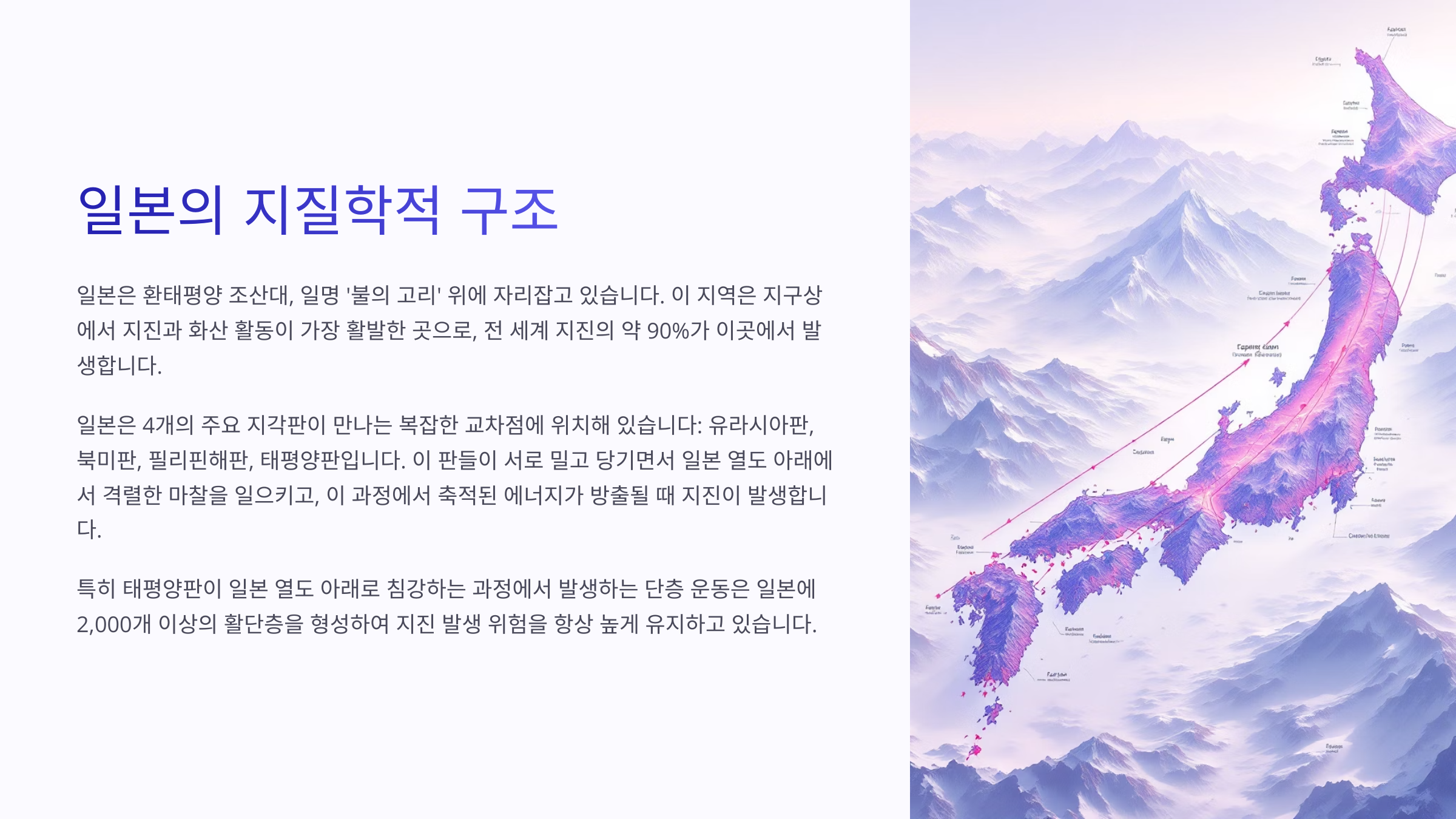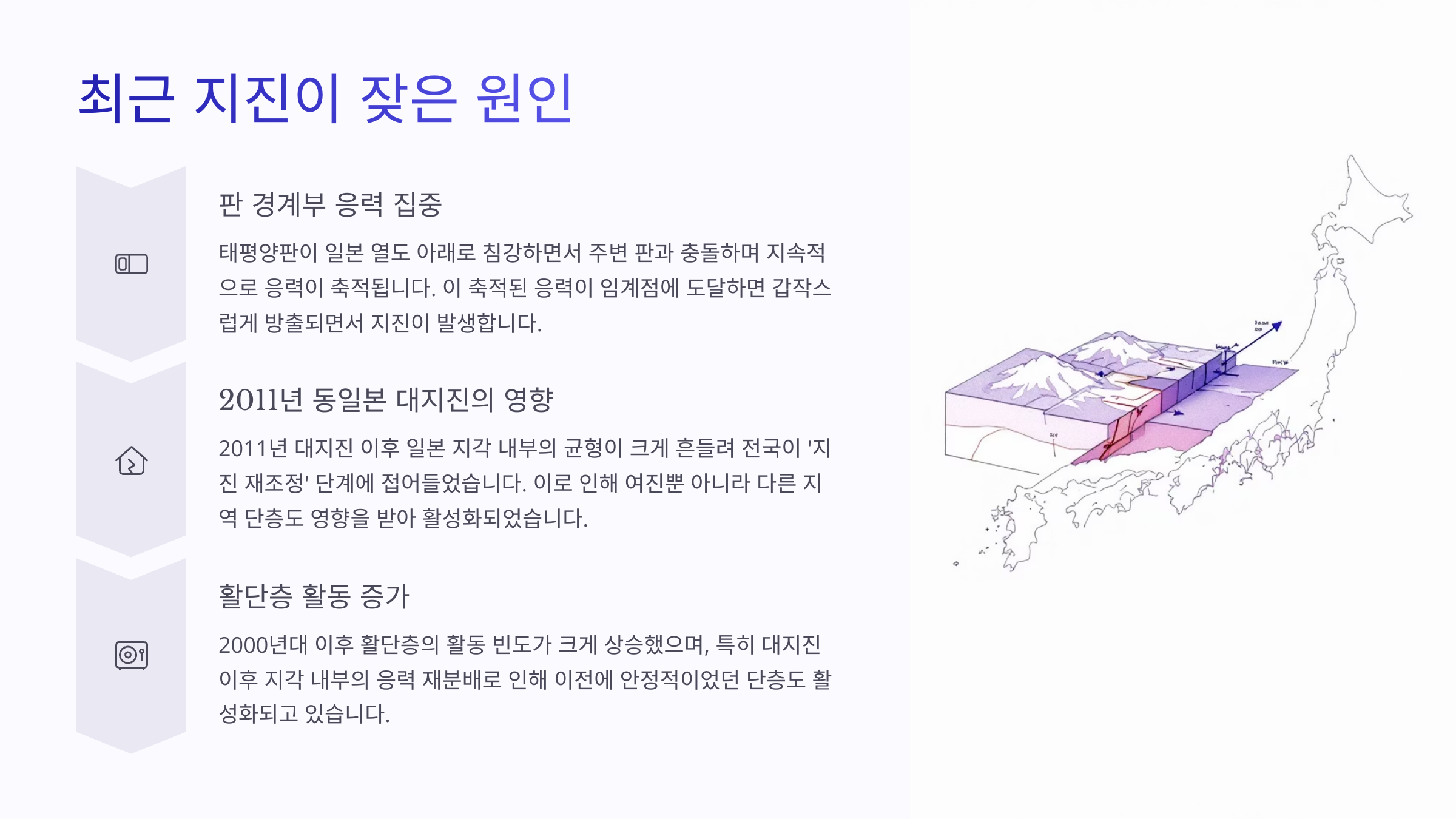 이제 왜 일본이 지진에 그렇게 취약한지 조금은 이해가 되셨죠? 그럼 지금부터 최근 들어 왜 유독 지진이 잦아졌는지, 그 구체적인 원인에 대해 알아볼게요 🔎