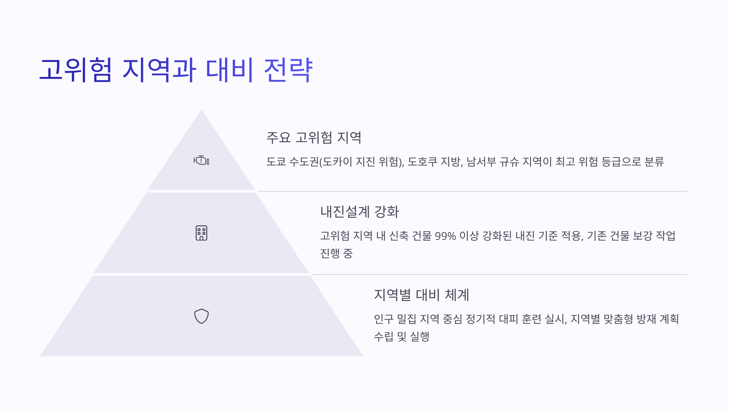 | 도쿄 수도권 | 단층 밀집, 인구 집중 | 도카이 대지진 우려 |