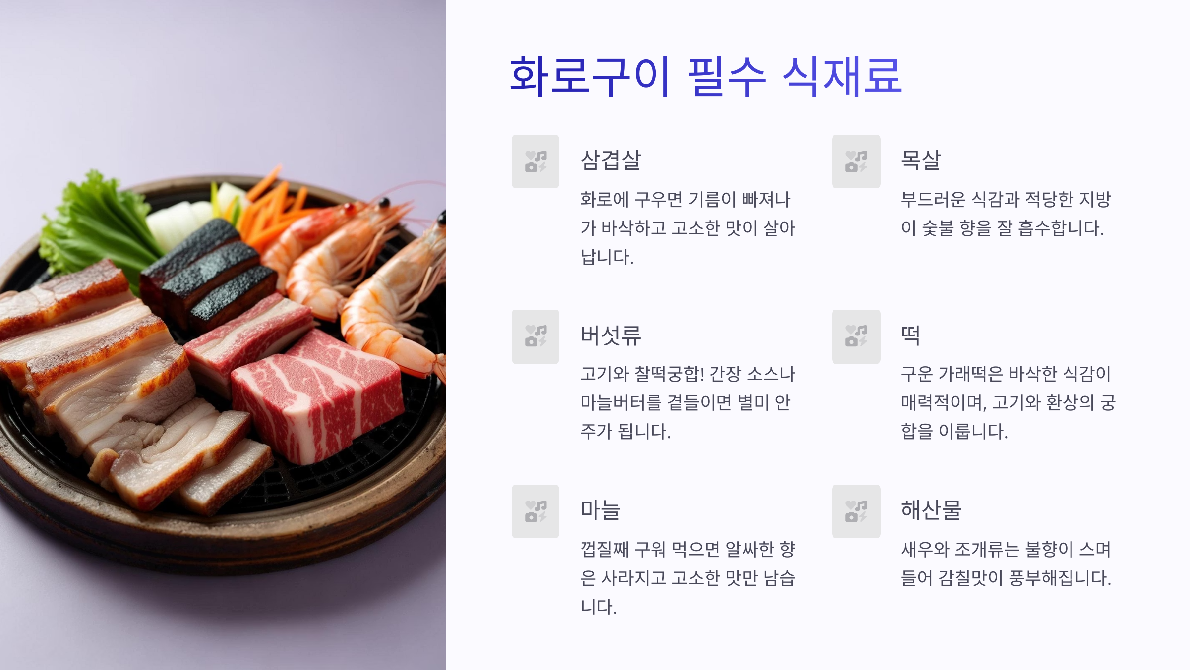 위 표는 화로구이 재료를 선택할 때 참고하면 좋은 조합을 정리한 것이에요. 고기를 중심으로 구성하되, 버섯이나 해산물로 변화를 주면 질리지 않고 균형 잡힌 식사가 가능하답니다.