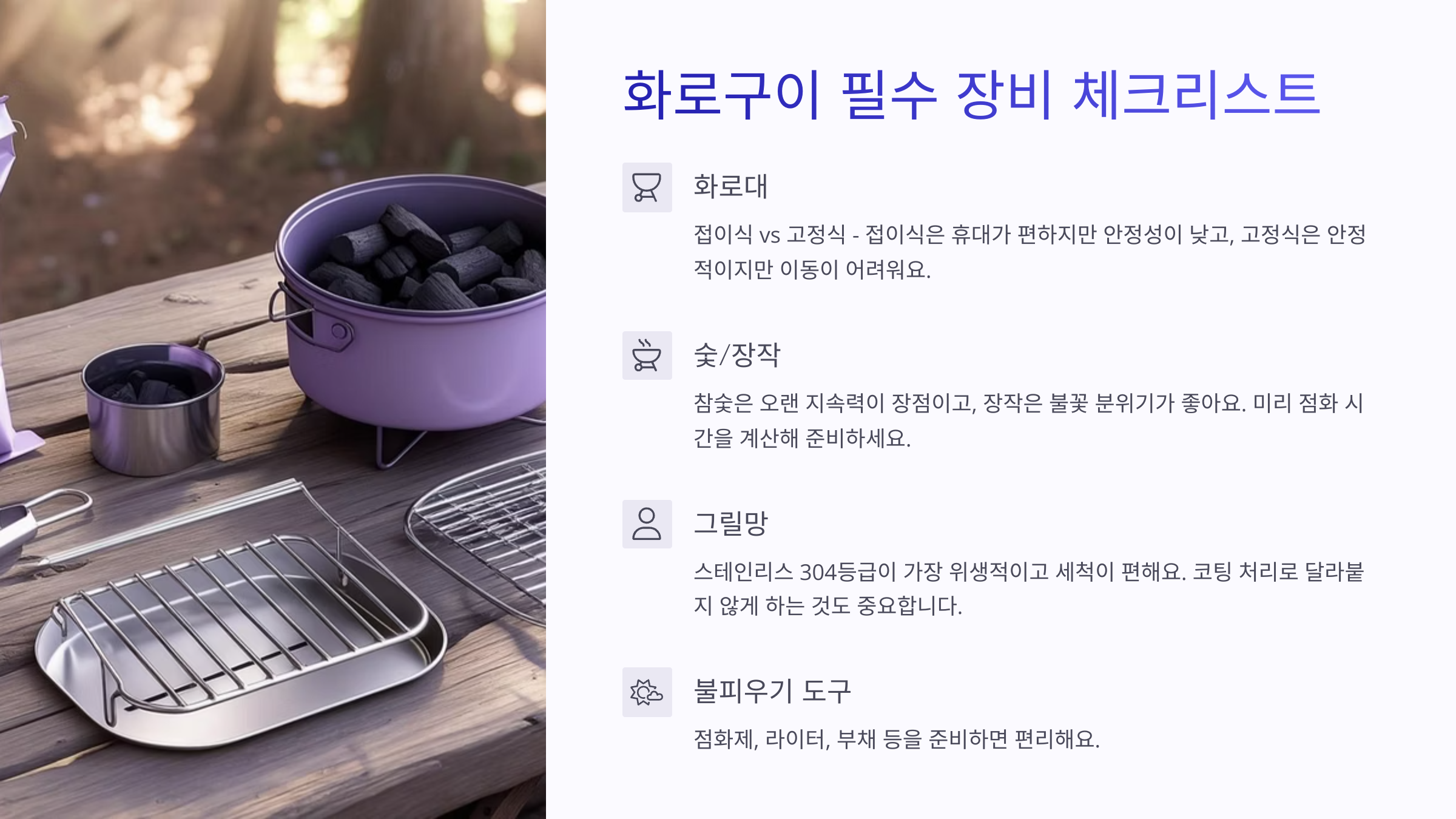 처음 캠핑장에서 화로구이를 준비한다면 어떤 장비가 필요한지 막막할 수 있어요.