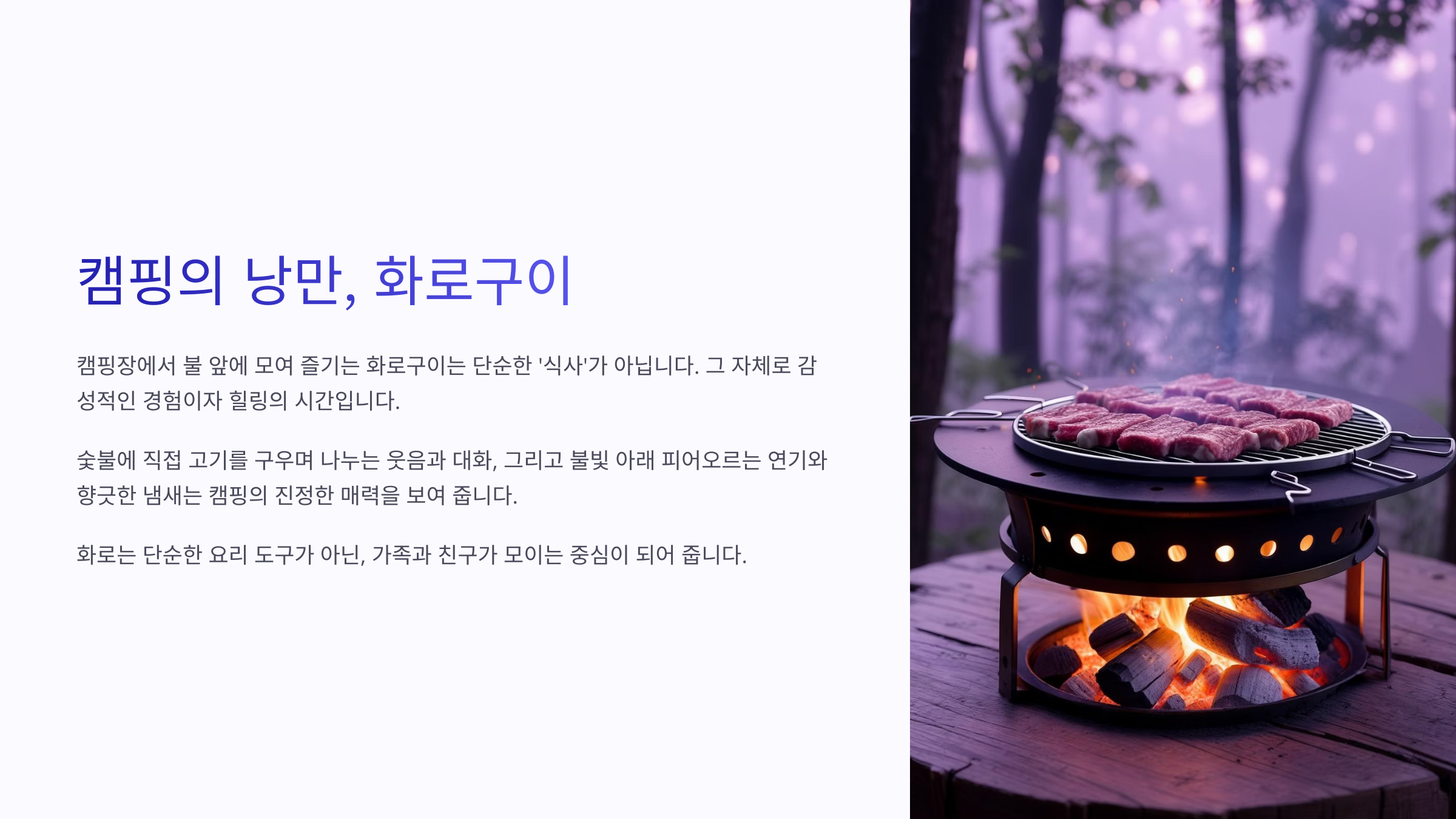 📌 요약하자면, 캠핑장 화로구이란 '불 앞에서 만들어가는 특별한 시간'입니다. 따뜻한 불, 맛있는 음식, 그리고 사랑하는 사람들과의 웃음. 이것이야말로 진정한 캠핑의 로망이 아닐까요?