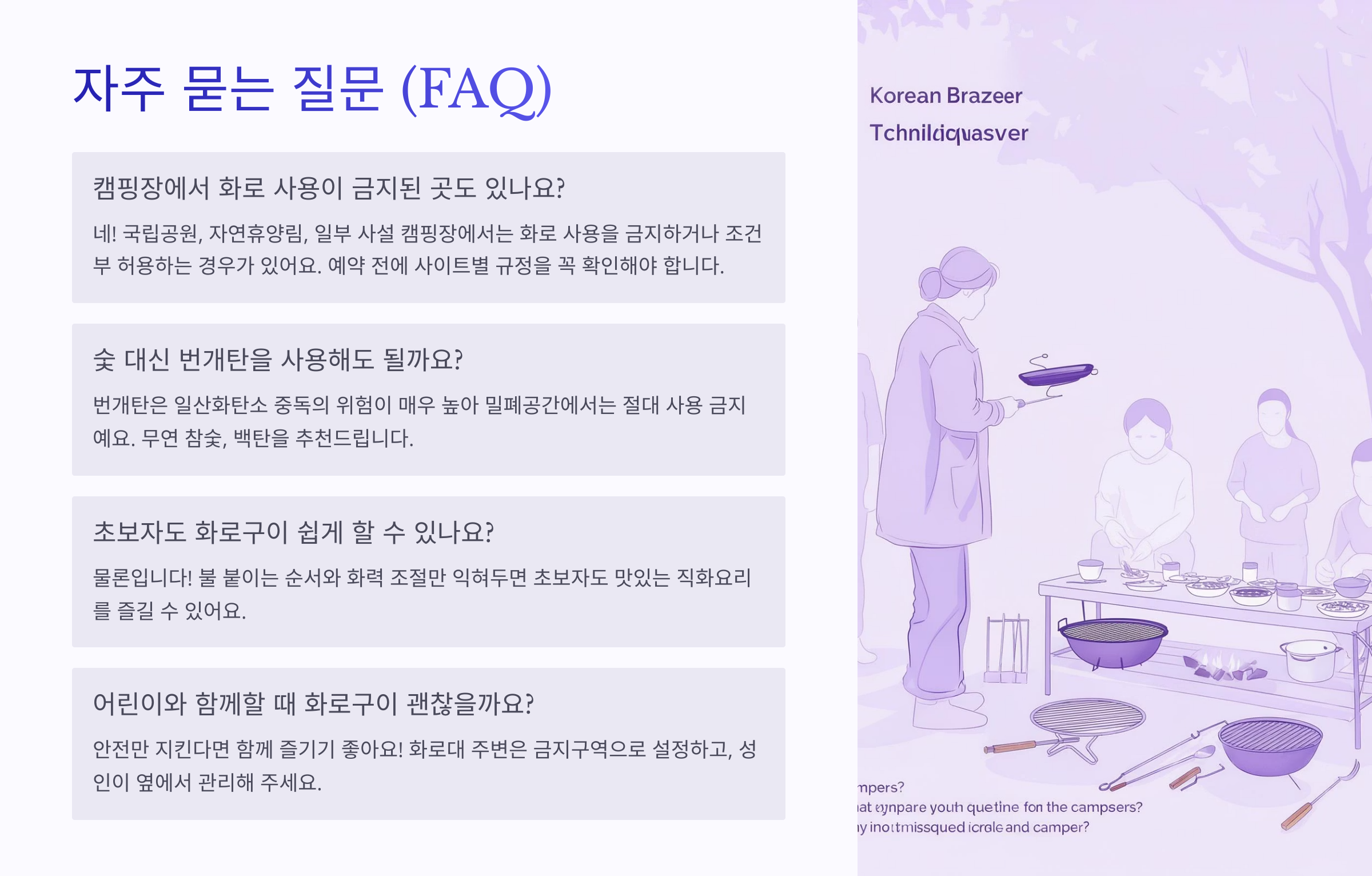A1. 네! 국립공원, 자연휴양림, 일부 사설 캠핑장에서는 화로 사용을 금지하거나 조건부 허용하는 경우가 있어요. 예약 전에 사이트별 규정을 꼭 확인해야 하고, 불판 대신 가스 버너나 전기 그릴만 허용되는 곳도 있어요.
