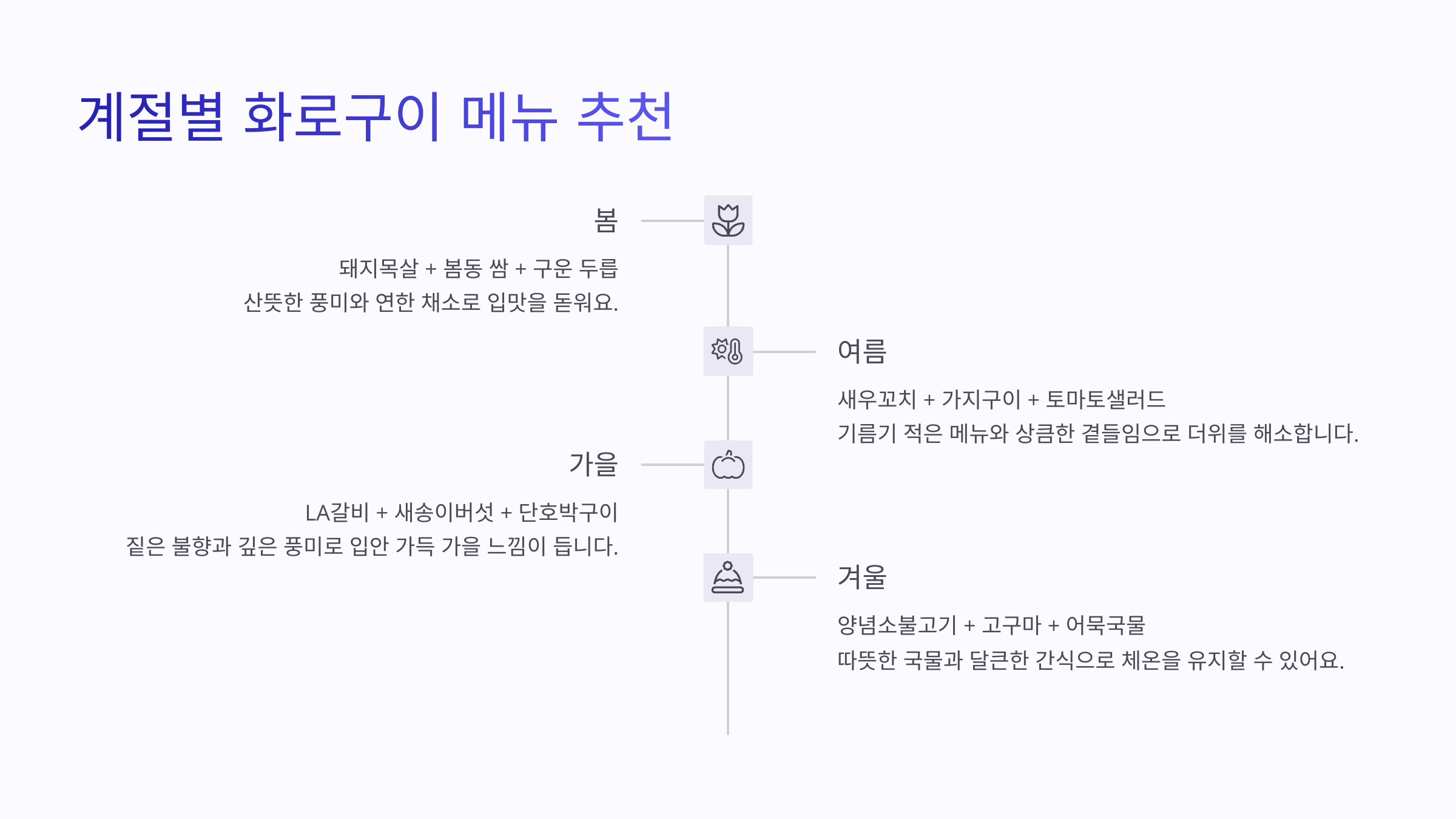 계절마다 기온도 다르고, 캠핑장에서 느껴지는 감성도 조금씩 달라지죠. 화로구이도 그 분위기에 맞춰 계절별로 어울리는 재료와 조리법을 선택하면 훨씬 더 감동적인 한 끼를 즐길 수 있어요.