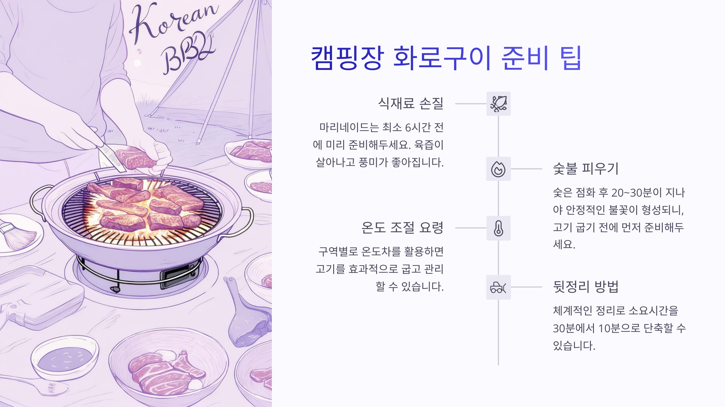 이런 준비 팁만 기억해도 캠핑장에서의 화로구이는 ‘노력 대비 만족도 최고’의 요리로 거듭날 거예요!