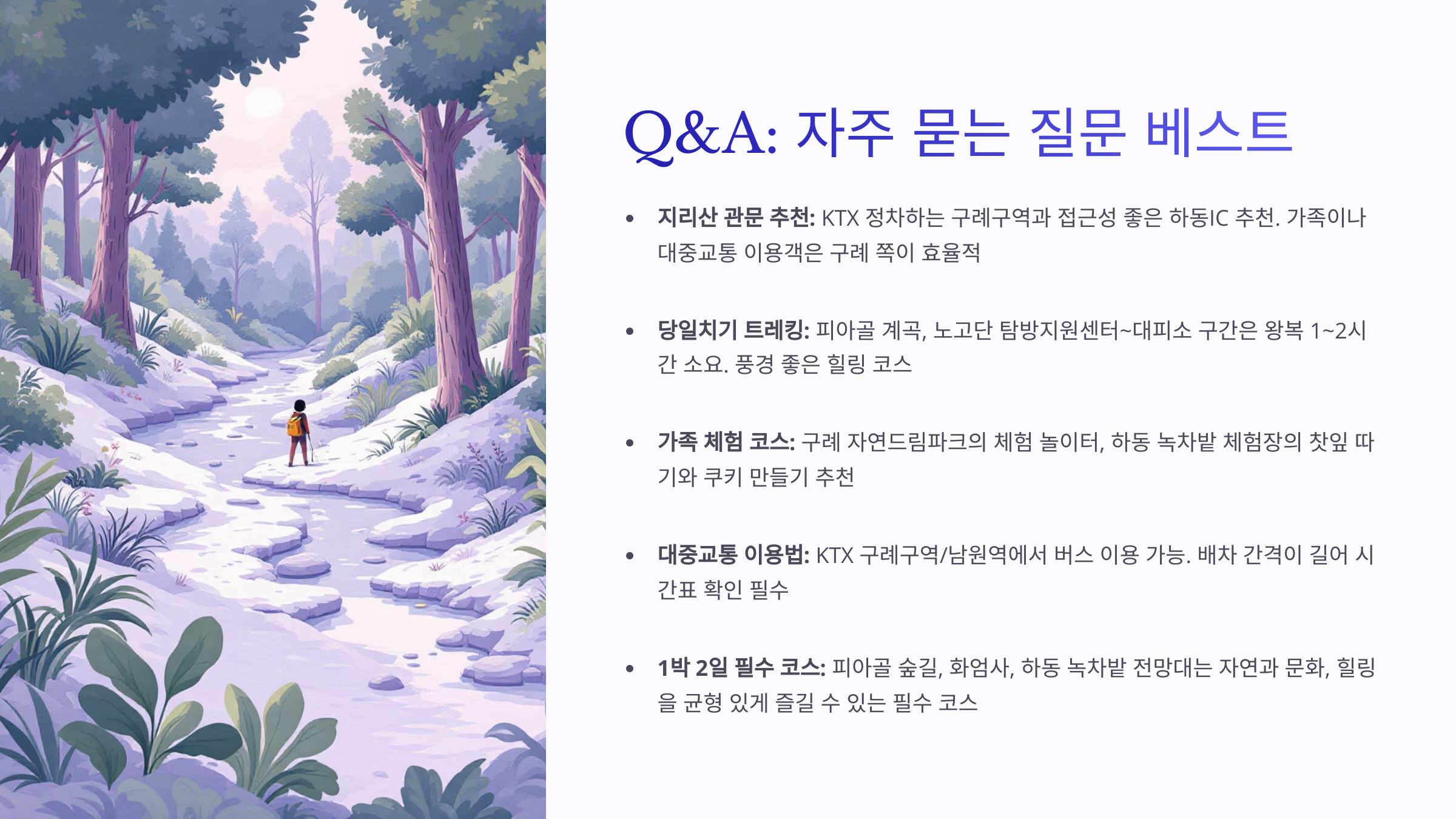 A7. 대부분 사람들이 어렵다고 생각하는 이유는 천왕봉 등반 때문이에요. 하지만 천왕봉을 제외하면, 대부분의 탐방로는 완만한 오르막과 정돈된 길이 많아서 초보자도 문제없이 다녀올 수 있어요. 둘레길이나 피아골은 가족, 중장년층도 편하게 걸을 수 있는 코스랍니다.
