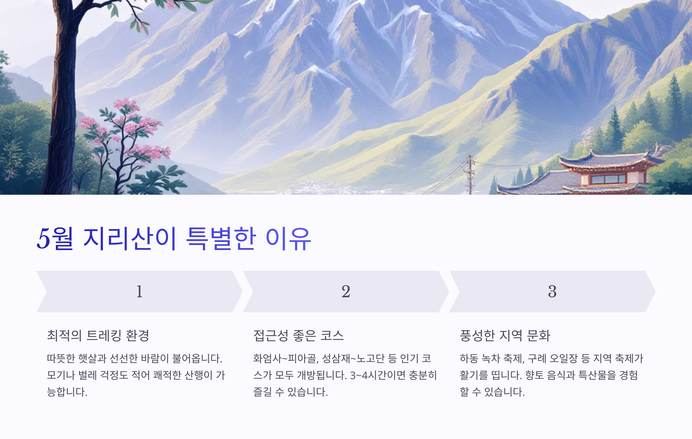 또 하나, 5월은 지역 문화도 풍성한 시기입니다. 하동 녹차 축제(5월 초~중순)는 전국에서 많은 여행객이 찾는 축제 중 하나이며, 구례 오일장이나 남원의 전통시장도 이 시기에 더욱 활기를 띱니다. 특산물, 수공예품, 향토 음식들을 직접 체험하고 맛볼 수 있어, 여행의 재미를 한층 더해줍니다. 이런 이유로 5월의 지리산은 단순한 산행을 넘어 자연+문화+힐링을 모두 경험할 수 있는 ‘완성형 여행지’로 주목받고 있어요.