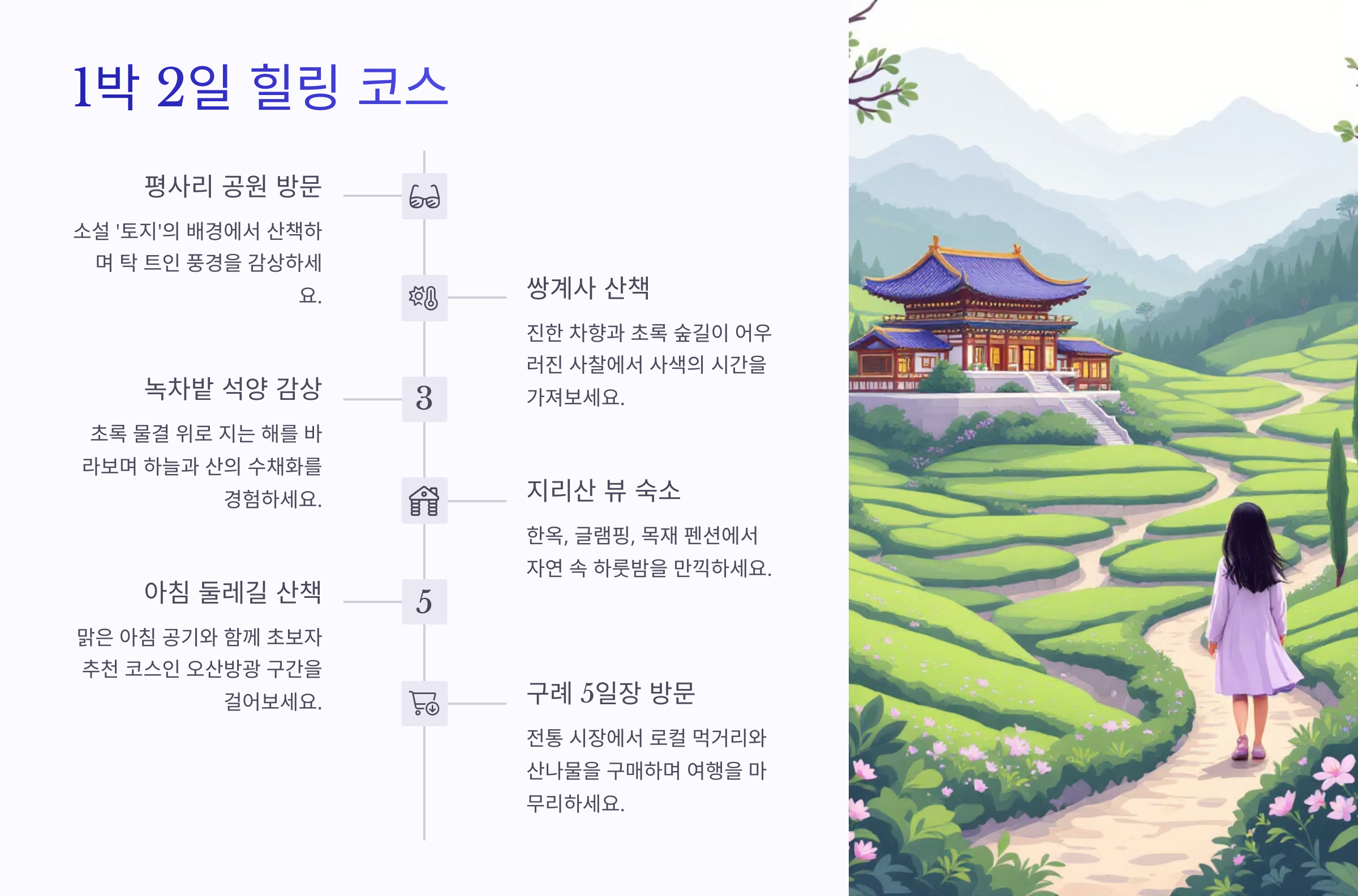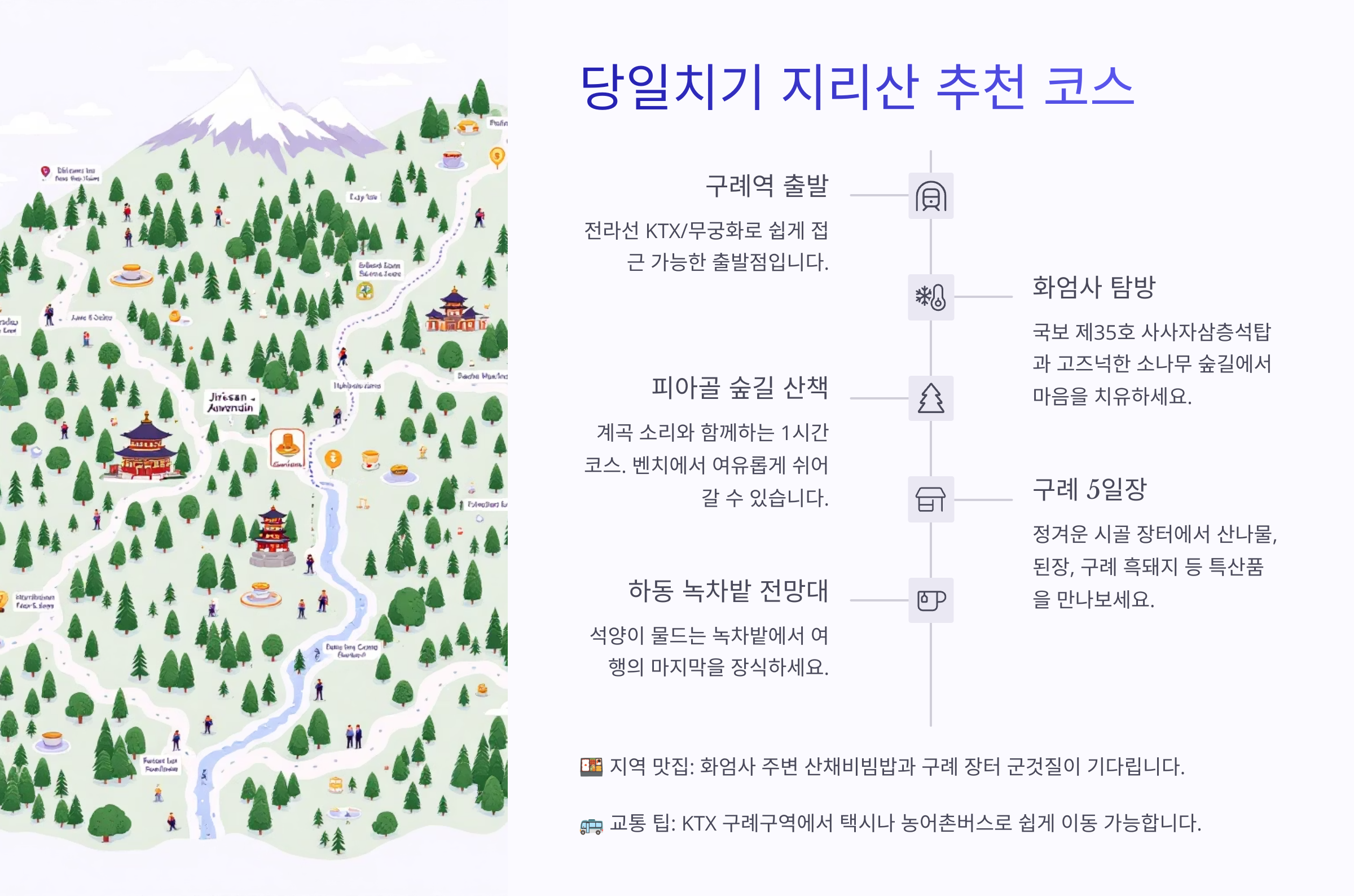 구례역 출발 → 화엄사 탐방 → 지리산 피아골 산책 → 구례 5일장 → 하동 녹차밭 전망대 → 귀가
